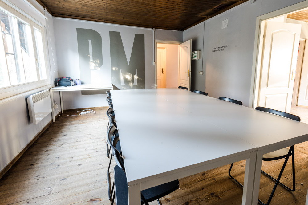 PM na trawie składa się z przestrzeni kreatywnej (pokój warsztatowy, salon spotkań, taras, przestronny ogród) oraz wspólnej przestrzeni funkcjonalnej (aneks kuchenny, łazienka, pomieszczenia magazynowe). Na miejscu dostępne są stoły, krzesła, stoliki, koce, rzutnik i flipcharty oraz sieć WiFi. Istnieje możliwość doposażenia domku w inne potrzebne meble, urządzenia oraz system nagłośnienia – w tym celu prosimy o wcześniejszy kontakt.